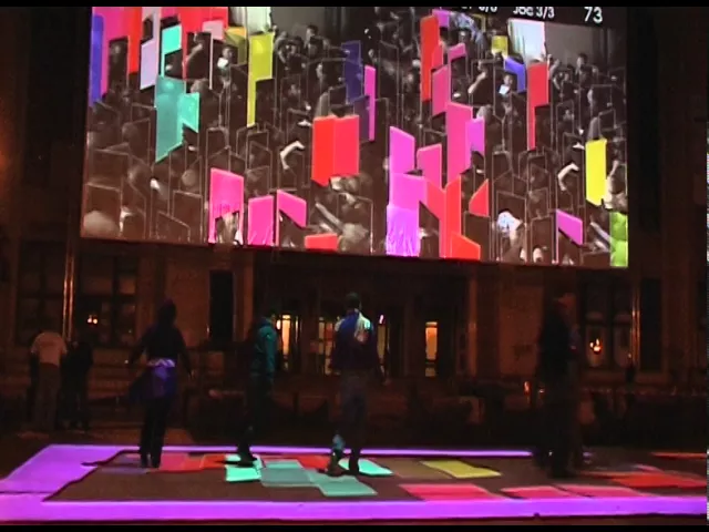 The vertical screen displays footage of crowds in motion. At the start of each session, figures within the crowd are concealed by colored rectangles, which are simultaneously projected onto the ground plane. When a participant steps on a rectangle, it disappears from both surfaces, revealing the previously hidden figure on the vertical screen while triggering a corresponding sound. Each group of participants thus generates a unique audiovisual composition.