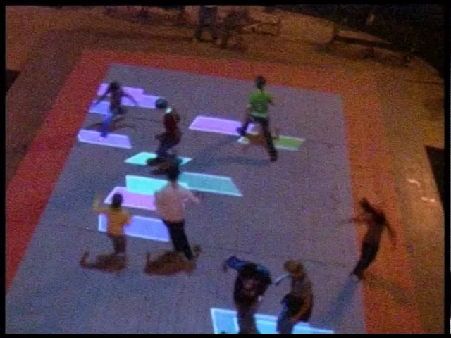 The installation requires no wearable technology, allowing participants complete freedom of movement. As they run, walk, or jump across the rectangles, participants unconsciously mirror the rhythm of the projected crowds, creating an spontaneous, emergent choreography. Absorbed in the act of play, participants remain unaware of their own gestures. The work operates at the intersection of individual agency and collective behavior, making visible the tension between personal action and group dynamics."