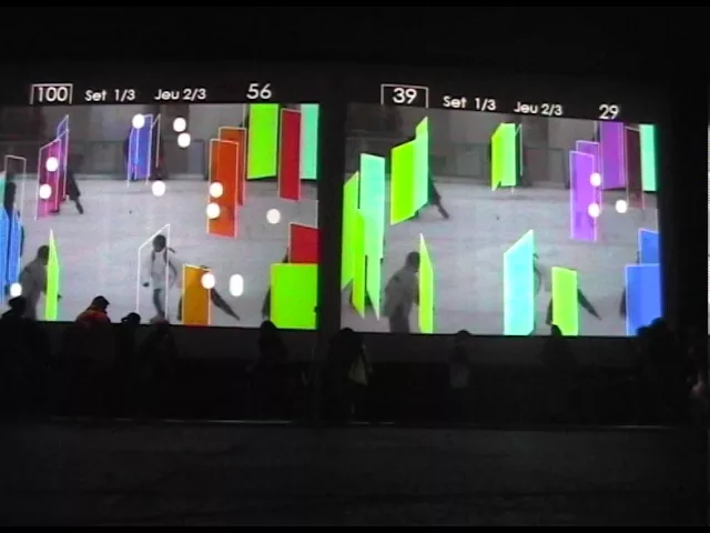 Upstream explores collective and individual mobility : how individuals carve out their own trajectories within the collective movement of the crowd.The work functions as an interactive game in which participants engage with a large-scale vertical projection by stepping on colored rectangles mapped onto the ground surface.